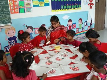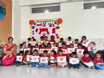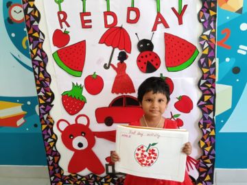 The joy didn’t stop there! Children also enjoyed colouring red objects and leaf/vegetable printing using red paint. Apples, roses, and ladybugs came alive through their art, making their creativity bloom. Teachers narrated simple red-themed stories and conducted colour-sorting games that kept the young minds engaged throughout.